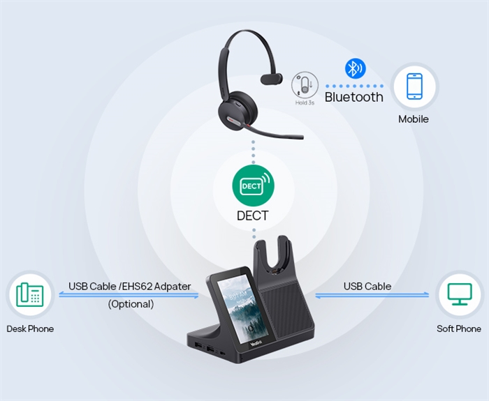 - Forbindelsesteknologi: Yealink WH64 tilbyder både kablede og trådløse forbindelsesmuligheder, herunder avanceret Bluetooth 5.0 teknologi, som sikrer stabil og klar kommunikation op til 50 meters rækkevidde.